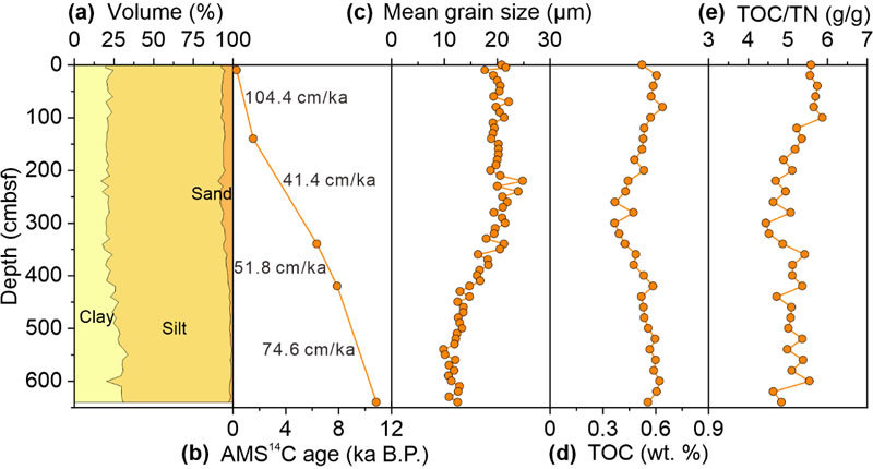 图3. 南海东沙沉积柱状样粒度参数、年龄模型和地球化学深度剖面图:(a)陆源沉积物组成;(b)AMS 14C定年结果;(c)平均粒径;(d)TOC含量;(e)TOC/TN比值。