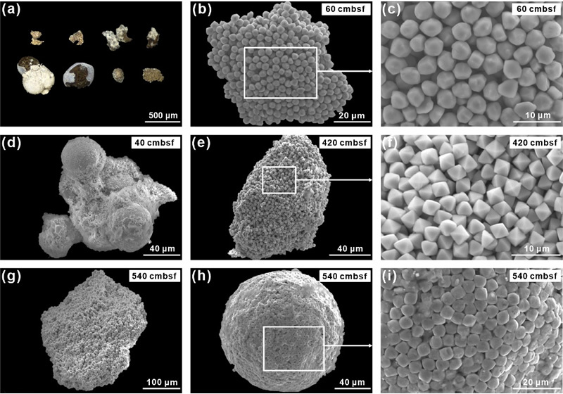 图2. 自生黄铁矿典型形貌图:(a)黄铁矿集合体光学显微特征;(b, c)截角八面体黄铁矿集合体;(d)草莓状集合体被松散微晶包裹;(e, f)八面体黄铁矿集合体;(g)团簇状草莓状黄铁矿集合体;(h, i)八面体微晶单个草莓状黄铁矿。