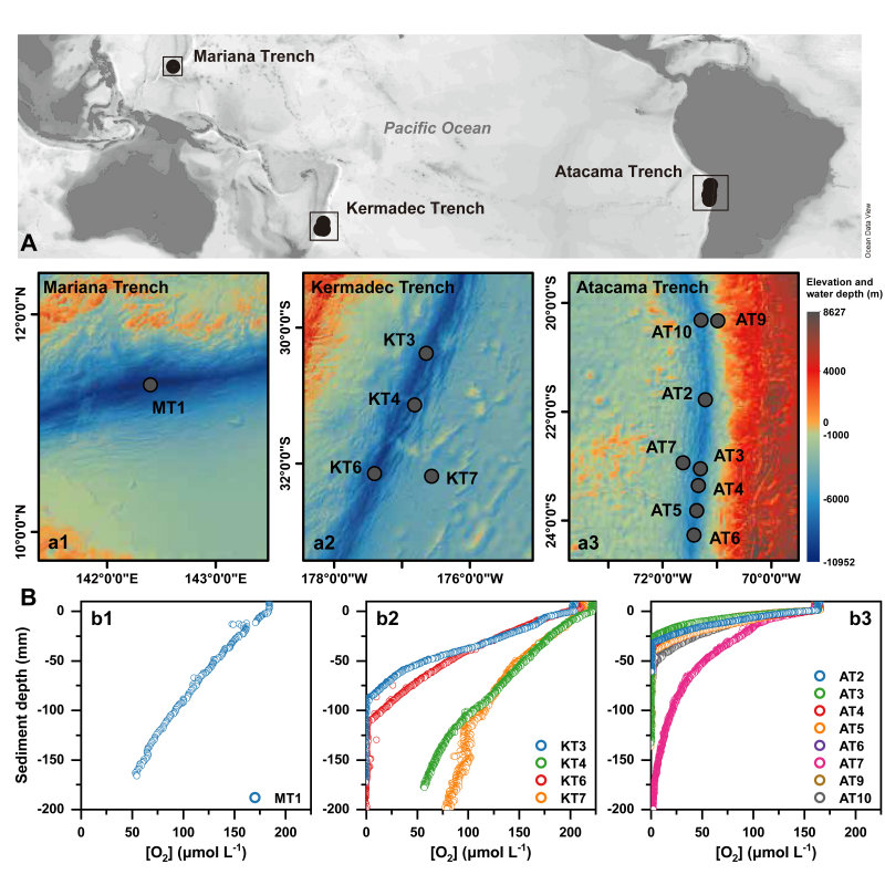近日,国际学术期刊《自然-通讯》(Nature Communications)在线刊登了上海海洋大学极端海洋研究团队与合作者的最新研究成果《Strong linkage between benthic oxygen uptake and bacterial tetraether lipids in deep-sea trench regions》(海沟区域底栖耗氧与细菌四醚膜脂化合物的强关联性)。该论文以三条太平洋深渊海沟为研究对象,分析了沉积物中来自细菌微生物的细胞膜脂化合物,并结合文献数据,提出了一个能够灵敏指示沉积物耗氧速率的新指标。该工作对于定量评估深海微生物活动强度和沉积有机碳的分解与保存具有重要意义。