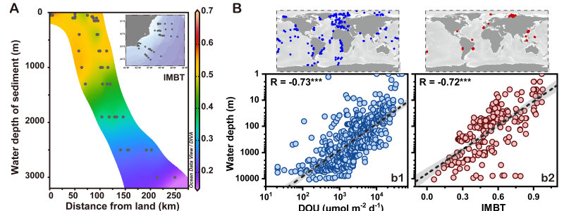 研究结果显示,无论是海沟间还是海沟内部,氧气扩散速率DOU都是影响brGDGTs组成和分布的最重要因素。基于DOU与不同brGDGTs化合物之间的强相关性,研究团队建立了异构-甲基化指标(英文缩写:IMBT)。IMBT指标反映了无环brGDGTs的异构化和甲基化程度,与DOU之间表现出显著的相关性(r = 0.88; P < 0.001;图2)。在此基础上,论文整合了已发表的全球海洋数据,结果显示无论是在区域尺度还是全球尺度,IMBT指标与DOU之间都呈现随水深增加而下降的趋势(图3),该结果支持IMBT指标的广泛适用性。